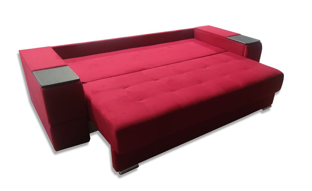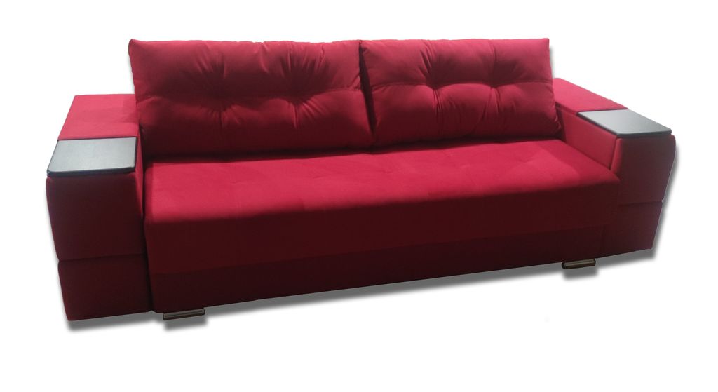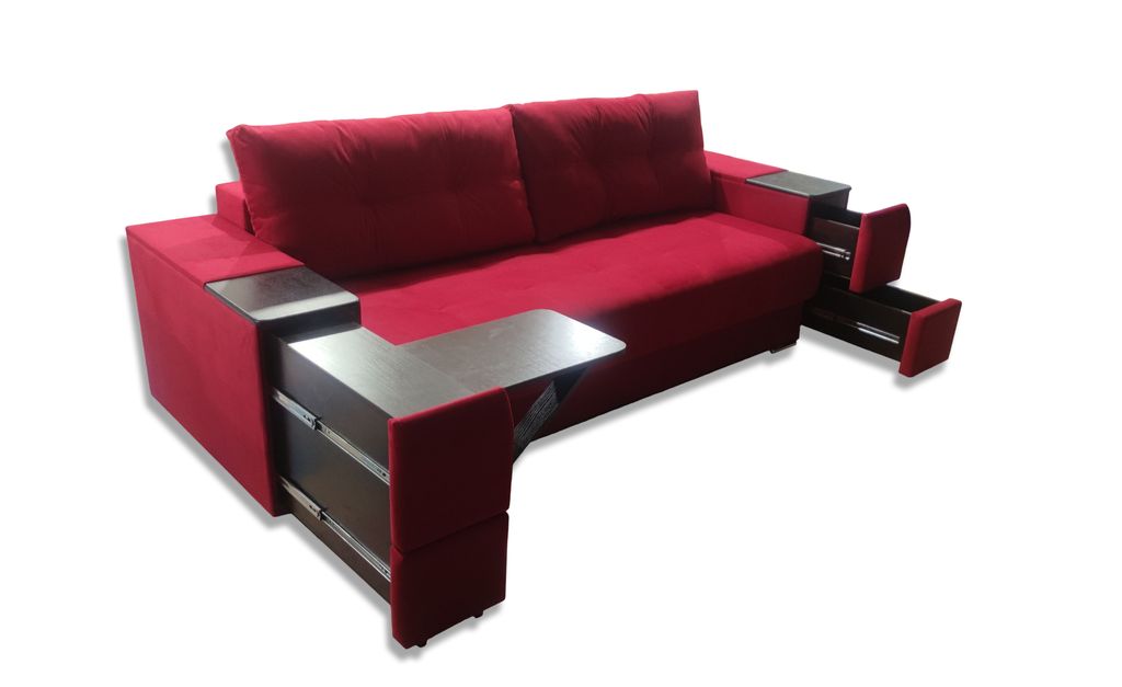 В подлокотники интегрирован журнальный столик и ящики для хранения нужных мелочей.